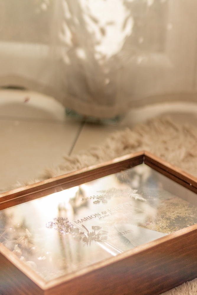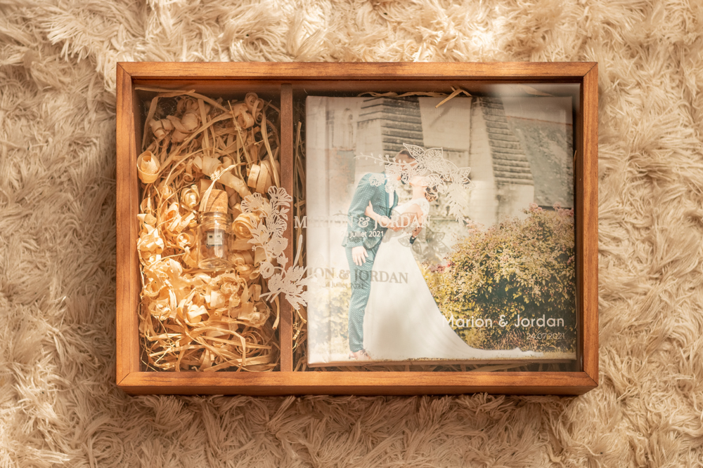 Le coffret Wood Clear est en en bois avec une vitre en plexiglass gravé ou imprimé de votre design confectionné par les soins de votre photographe